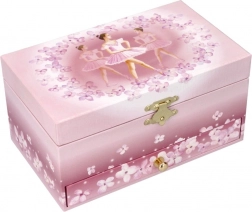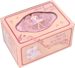 Cutie muzicală elegantă pentru bijuterii, pentru mici și mari iubitoare ale baletului. La deschidere, balerina începe să danseze și se aude melodia Lacul lebedelor. În interior găsești compartimente practice, o oglinjoară și spațiu pentru inele. Finisul roz delicat, cu motiv floral și de balet, împodobește frumos camera copilului sau măsuța de toaletă.