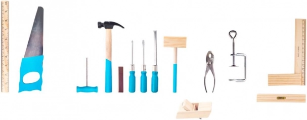 Sunt incluse instrumente de bază precum fierăstrău, ciocan, șurubelnițe, cheie și riglă, din combinație de lemn și metal cu mânere albastre confortabile. Setul este conceput pentru joacă sigură și cu sens și susține independența și imaginația.