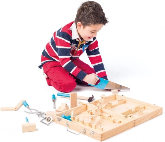 Acest set de unelte din lemn în valiză le oferă copiilor o experiență realistă de „reparații” și creație, în mod sigur și distractiv. Datorită valizei solide cu catarame metalice, toate piesele au locul lor și sunt mereu gata de joacă acasă și în călătorii. Copiii își antrenează prin joc îndemânarea, coordonarea mână–ochi și gândirea logică.