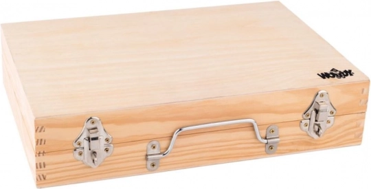 Valiza robustă din lemn, cu închidere metalică și mâner, protejează uneltele și permite transportul facil oriunde – în cameră, la cabană sau la bunici.