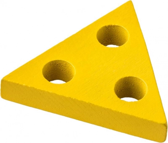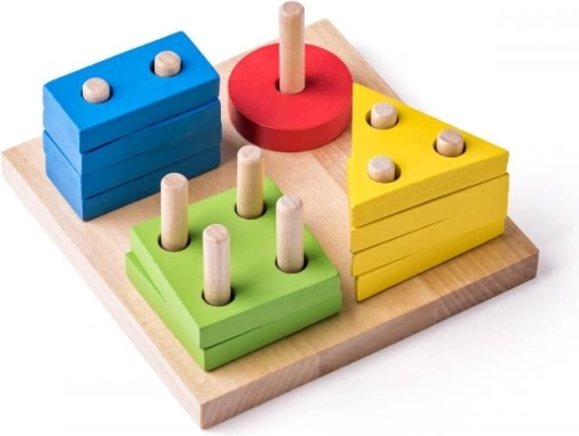 Inserția colorată din lemn dezvoltă la copii motricitatea fină, coordonarea mână–ochi și capacitatea de distinguere a culorilor și formelor. Pe baza solidă din lemn se află pini pe care copiii introduc cercuri, dreptunghiuri, triunghiuri și pătrate în funcție de numărul de orificii.
