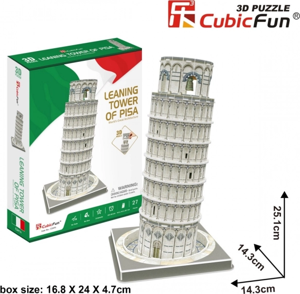 Cu acest set de puzzle 3D este posibil să îți creezi propria replică a faimosului Turn Înclinat din Pisa. Setul conține 27 de piese fabricate dintr-un material special ce seamănă cu spuma. Piesele sunt numerotate, predecupate pe foi și sunt ușor de scos și de asamblat conform instrucțiunilor incluse. Asamblarea nu necesită niciun adeziv sau unelte speciale, ceea ce înseamnă că și începătorii se vor bucura de acest proiect. După asamblare, construcția va avea dimensiunile de 14,3 x 14,3 x 25 cm.