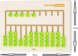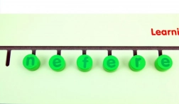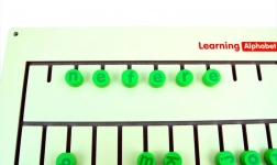 Jetoanele verzi cu litere se introduc și se deplasează în canale, astfel încât copiii exersează jucându-se recunoașterea literelor și formarea cuvintelor simple, precum „apple”.