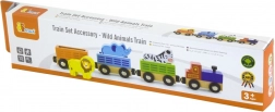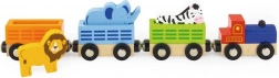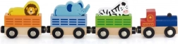 Trenulețul din lemn cu animale de la ZOO este un accesoriu ideal pentru seturile de tren pentru copii sau o jucărie de sine stătătoare. Locomotiva și cele trei vagoane viu colorate, cu leuț, elefant și zebră, se conectează cu magneți, astfel încât sunt ușor de manevrat, iar copiii pot asambla și desprinde garnitura după fantezie.