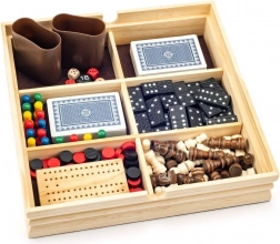 În cutie găsești table de joc rotative sau separate pentru jocurile preferate: șah, Moara, table (backgammon) și Nu te supăra, frate. Piesele colorate clar și câmpurile de joc cu contrast bun asigură vizibilitate excelentă chiar și pentru copii. Dimensiunile compacte de 30 × 28 × 6 cm sunt ideale pentru casă, cabană sau călătorii.