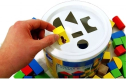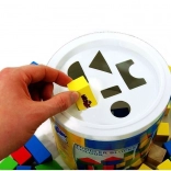 Găleata cu capac are orificii în forme diferite, în care copiii introduc cuburile corespunzătoare, sprijinind astfel dezvoltarea abilităților de recunoaștere.
