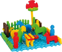 - 4× animăluț, familie (tată, mamă, băiat, fată), placă de bază, piese de construcție