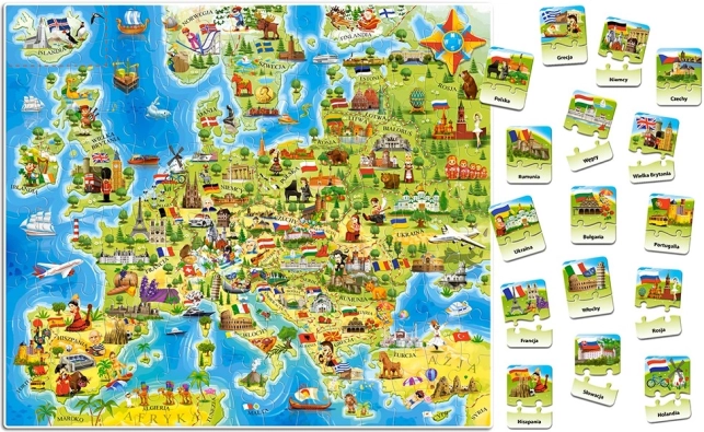 Puzzle-ul educativ Castorland Harta Europei îmbină distracția cu învățarea. Copiii asamblează o hartă mare a continentului și, datorită pieselor de quiz, descoperă capitale, obiective turistice și simboluri tipice ale fiecărei țări. Pe hartă vei găsi, de exemplu, Podul Carol în Cehia, Colosseumul în Italia, Turnul Eiffel în Franța, Poarta Brandenburg în Germania, Sagrada Família în Spania sau Acropole în Grecia.