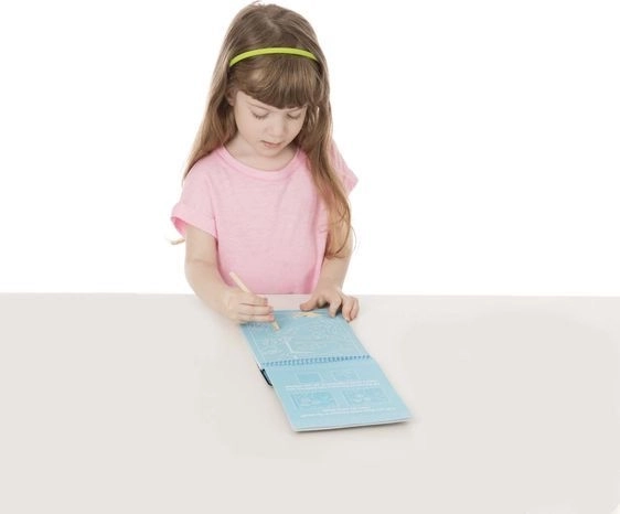 Un strat special ascunde culori vibrante pe care copiii le dezvăluie cu un stylus din lemn. Creație curată, fără vopsele și pensule.