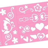 Șabloanele reutilizabile cu flori, inimioare și fluturi facilitează trasarea rapidă și curată a motivelor preferate.