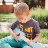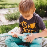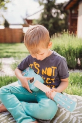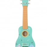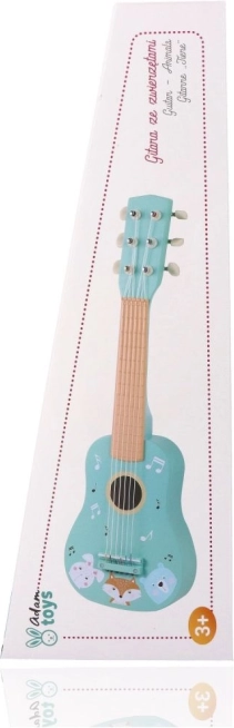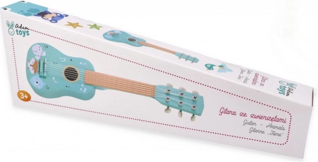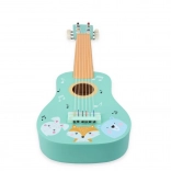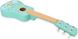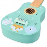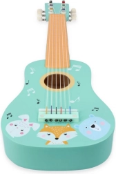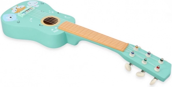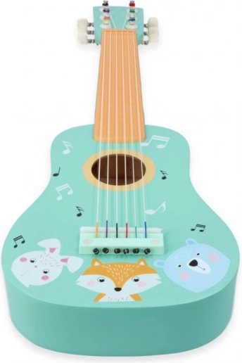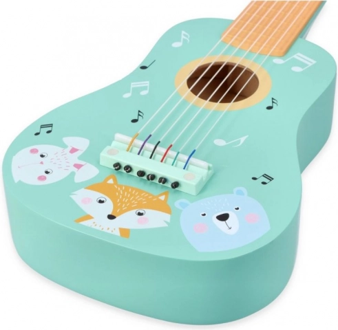 Chitară drăguță din lemn pentru copii, în culoare turcoaz, cu ilustrații cu animăluțe, care îi motivează pe micii muzicieni să descopere lumea muzicii. Oferă execuție durabilă din lemn, coarde reale și prindere ușoară, fiind ideală pentru primele încercări muzicale și dezvoltarea simțului ritmic și a creativității.