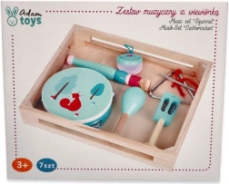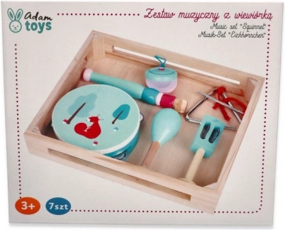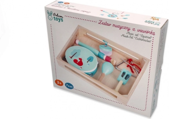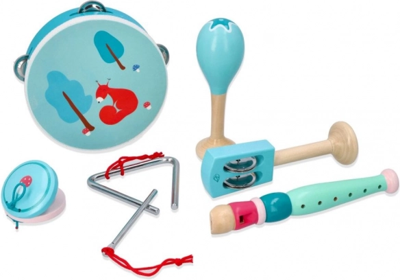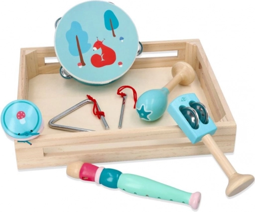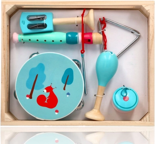 În set găsiți o tamburină cu patru clopoței și o drăguță veveriță, o flaută în nuanță de mentă, maracas cu motiv floral, castaniete cu burețel, clopoței de mână cu frunză, triunghi metalic cu baghetă, iar totul este așezat într-o tavă/cutie practică din lemn pentru depozitare și transport ușor. Excelent pentru cântat acasă, la grădiniță sau în cluburile de după școală.