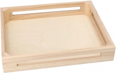 Toate piesele setului sunt aranjate îngrijit într-o tavă din lemn cu mânere – transport facil, ordine și depozitare sigură acasă sau la grădiniță.