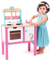 Descoperiți bucătăria WOODY cu motiv unicorn, care transformă camera copilului într-un studio culinar creativ. Datorită execuției atente din placaj și lemn de calitate, este stabilă, durabilă și atrăgătoare vizual – o alegere excelentă pentru joaca zilnică de-a găti.