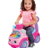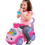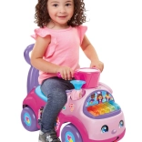 În partea frontală se află un clapier cu două moduri: redă 5 melodii vesele de marș sau permite joc liber, pentru ca micuțul să-și creeze propria muzică. Mânerul din spate oferă sprijin la primele pasuri, iar sub șea se găsește un compartiment practic pentru mărunțișuri.