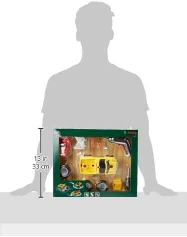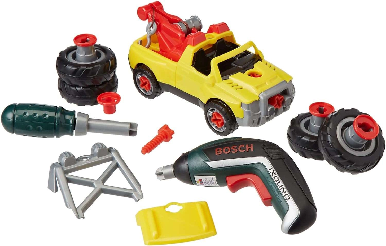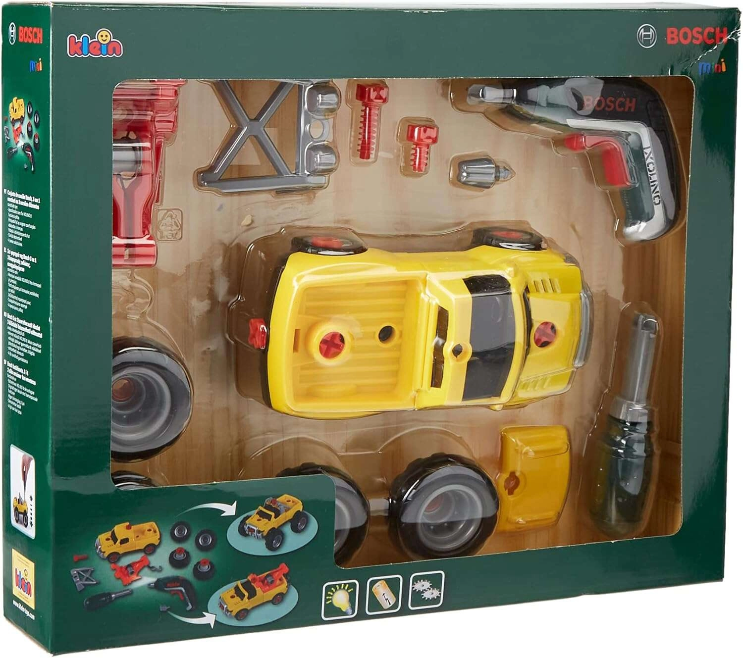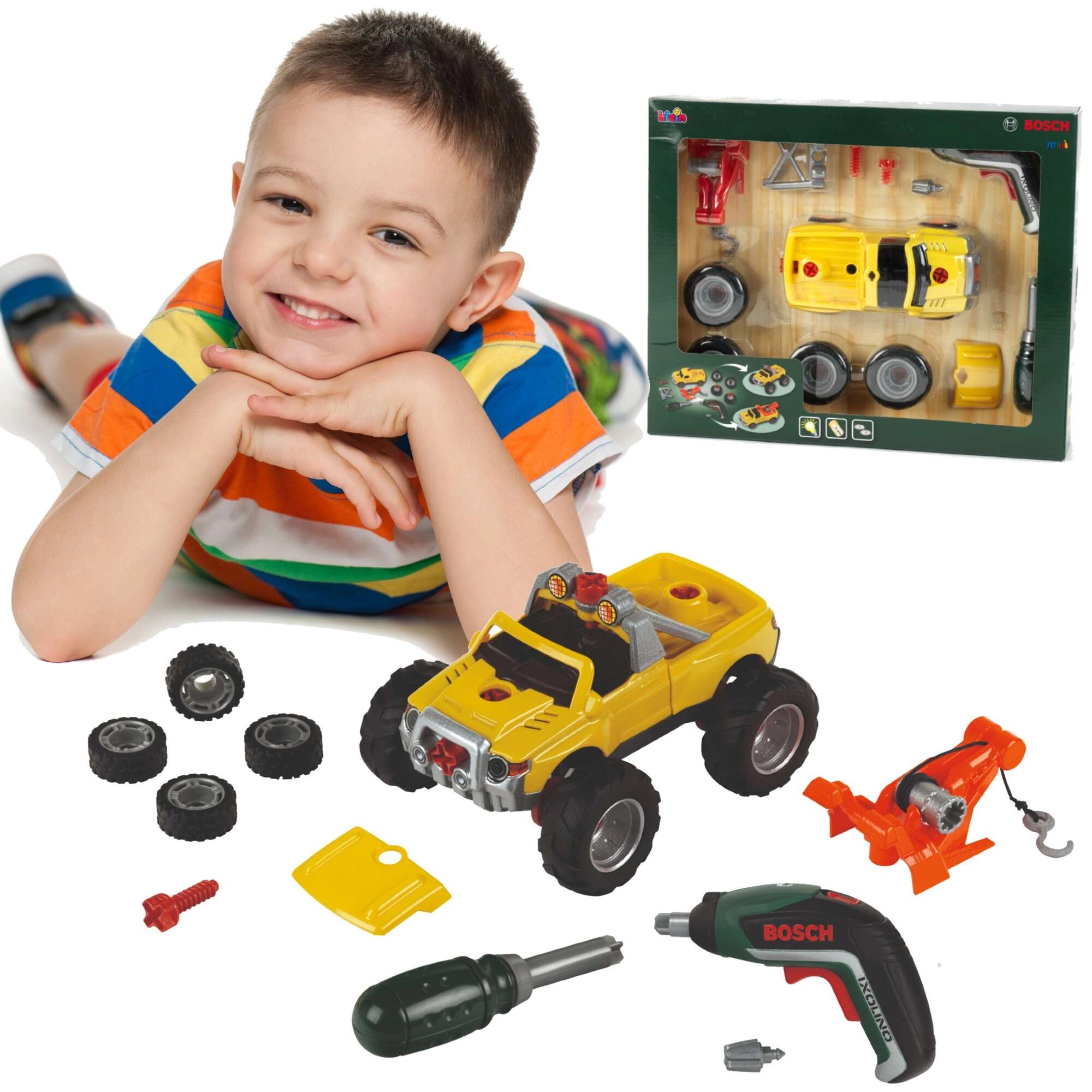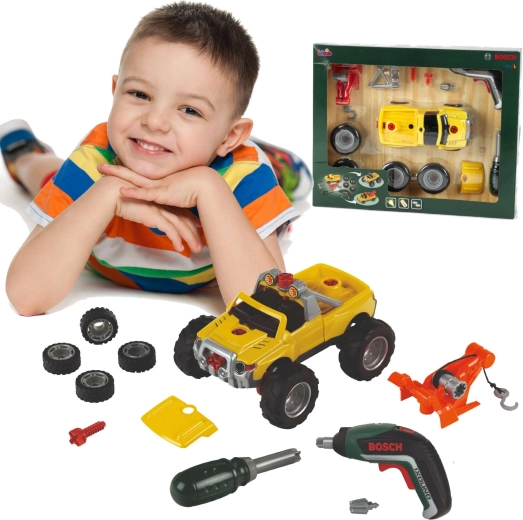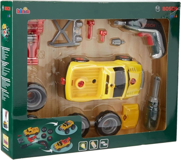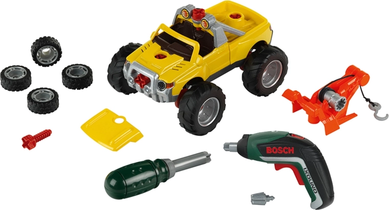 Pachetul include o mașină galbenă de asamblat 3 în 1, șurubelnița electrică Bosch Ixolino II cu funcționare bidirecțională și efect sonor, șurubelniță manuală, biți interschimbabili, roți pentru teren accidentat, cârlig de tractare roșu, mască și ramă cu faruri. Copiii pot reconstrui vehiculul în trei variante, astfel încât distracția nu se termină curând.