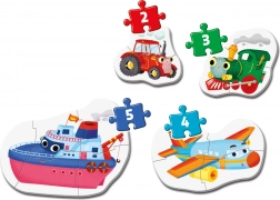 Descoperiți lumea distractivă a asamblării pentru cei mai mici. Acest set conține patru puzzle-uri separate cu motive ale diferitelor mijloace de transport și dificultate progresivă (2, 3, 4 și 5 piese), pentru ca cei mici să își poată construi treptat încrederea și abilitățile.
