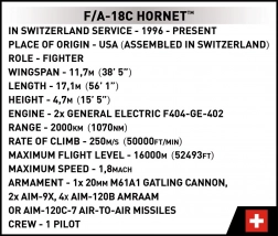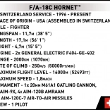 Îmbarcați-vă în lumea aviației cu modelul F/A-18C Hornet la scară 1:48, construit din 540 de cărămizi. Acest model este o copie fidelă a unui avion de luptă elvețian cu imprimări de calitate și multe piese mobile, inclusiv tren de aterizare rabatabil și roți rotative. În plus, oferă și arme sub aripi și o piesă specială pentru a plasa pilotul în cabină.