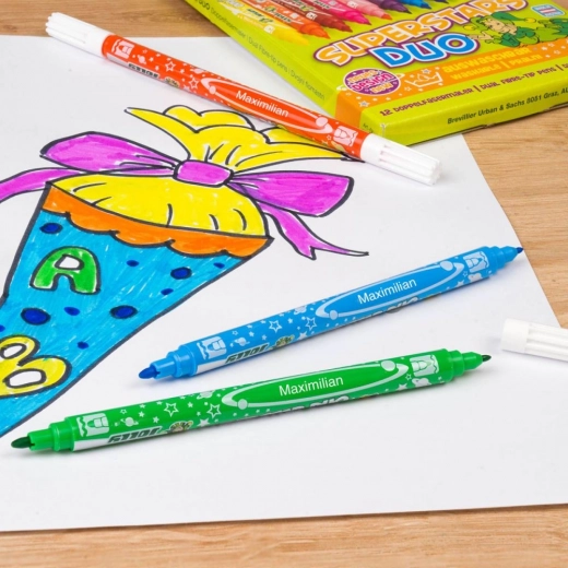 Carioci duble Superstars Duo – set cu 12 culori intense. Două vârfuri pentru detalii și colorare, lungime 17 cm, sigure pentru copii 3+, certificare CE.