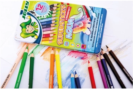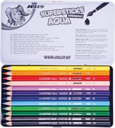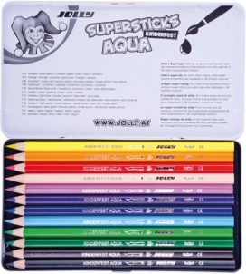 Set de 12 creioane acuarelă într-o cutie metalică practică pentru mici și mari creatori. Creioanele JOLLY Supersticks Aqua se estompează ușor cu apă pentru tranziții și efecte delicate, au un nucleu rezistent și o durată de viață îndelungată. Ideale pentru călătorii și creații acasă. Efect acuarelă, 12 culori intense, cutie metalică solidă, potrivite de la 3 ani.