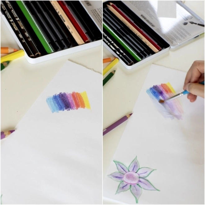 Creioanele pot fi ușor diluate cu apă – sunt suficiente câteva mișcări de pensulă pentru a obține tranziții și efecte acuarelă delicate.