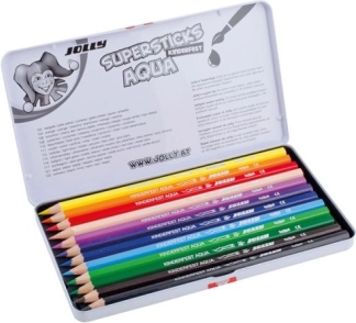 Descoperă posibilitățile creative cu creioanele acuarelă JOLLY Supersticks Aqua. Folosește-le uscat pentru acoperire intensă sau adaugă apă și transformă trăsăturile în picturi acuarelă delicate. Cutia metalică protejează creioanele în călătorii și acasă și le menține bine organizate.