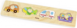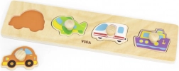 Culorile vesele și contururile clare ajută la dezvoltarea percepției vizuale și a vocabularului – copilul recunoaște mașina, barca, avionul sau rulota și învață să le numească. Execuția de calitate din lemn asigură durabilitate și joacă în siguranță.
