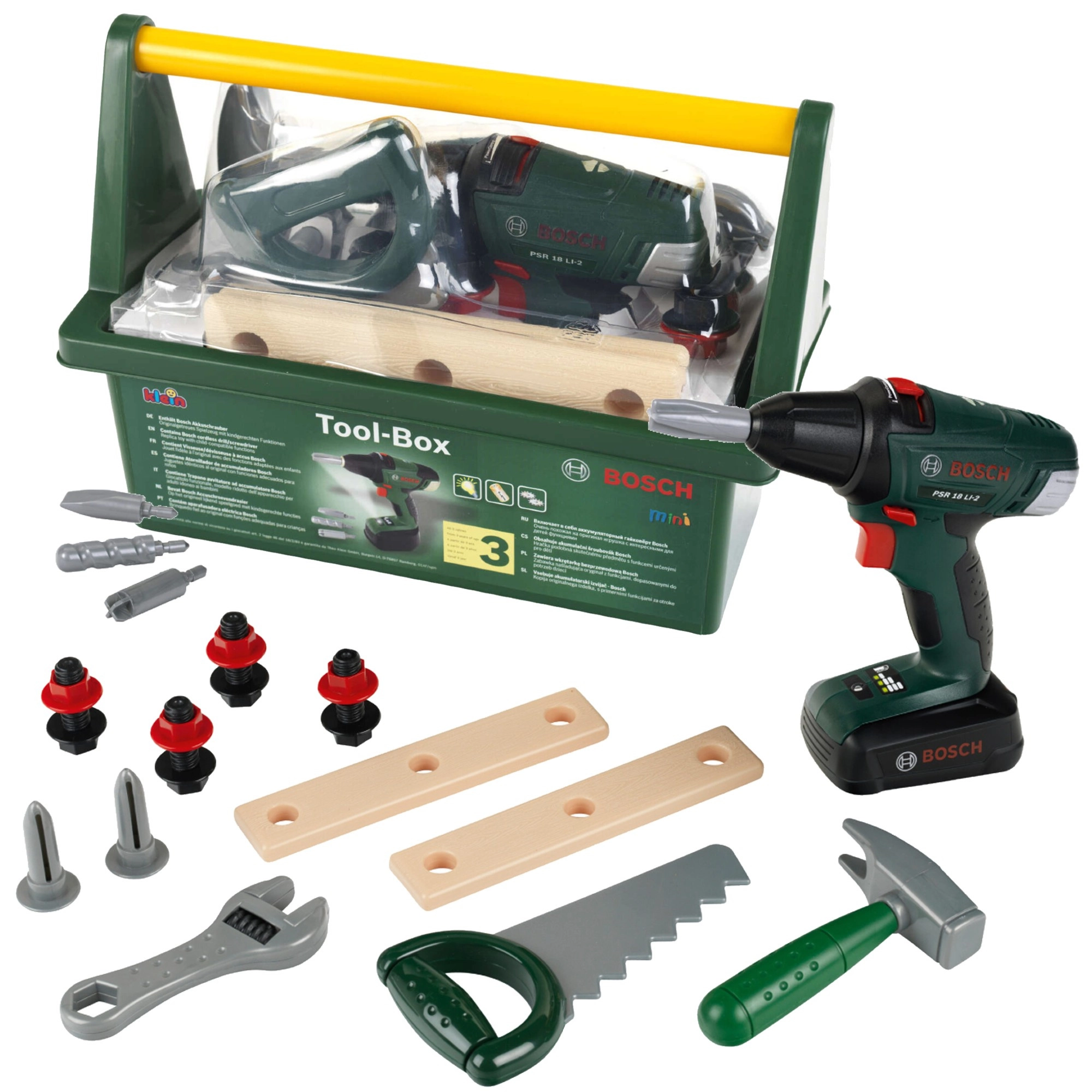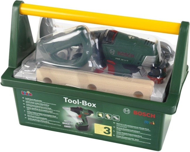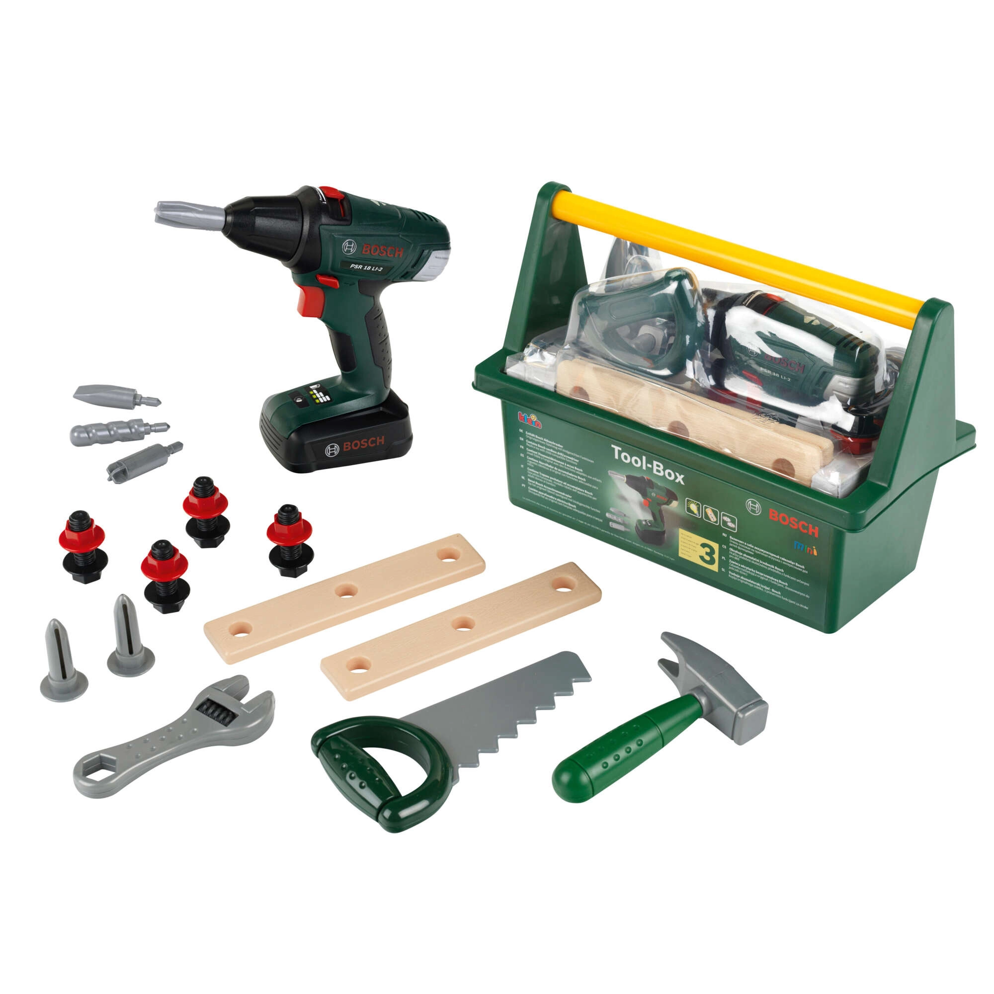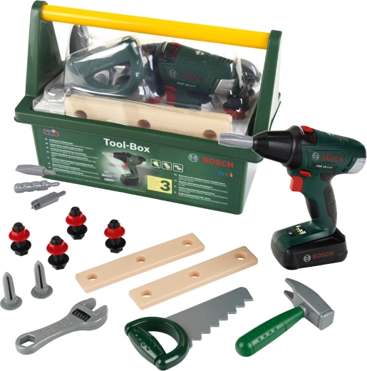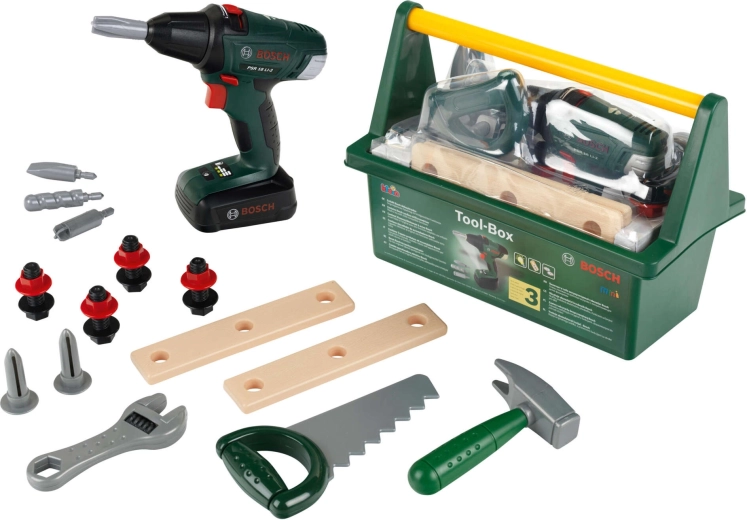 Acest set de calitate pentru copii este realizat sub licența BOSCH și este conceput pentru a imita fidel uneltele reale, fiind în același timp complet sigur pentru copii. Cutia robustă pentru unelte, de culoare verde închis, cu mâner galben confortabil păstrează toate piesele laolaltă și ușurează transportul.