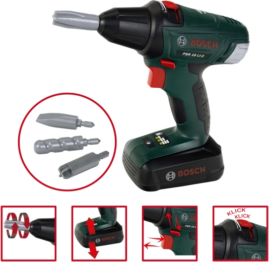 Vedeta principală este bormașina/șurubelnița fără fir cu sunet, efect luminos și șurub rotativ, care simulează perfect funcționarea unui instrument real. Sunt incluse 4 capete interschimbabile, fierăstrău cu mâner confortabil, ciocănel, cheie franceză, 2 plăcuțe din plastic cu orificii, 4 șuruburi și 2 cuie – toate din plastic rezistent.