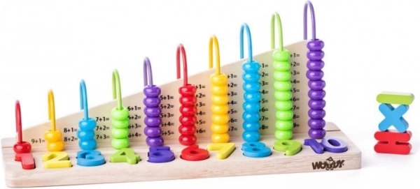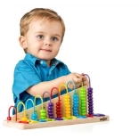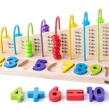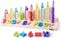 Setul conține un abac din lemn și 13 blocuri colorate detașabile în formă de cifre și simboluri +, - și =.