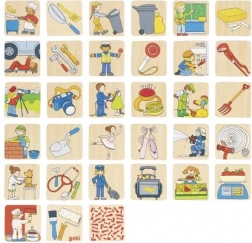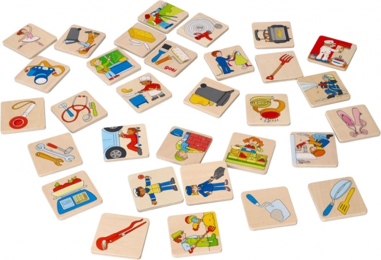 Pexeso-ul din lemn Meserii de la GOKI aduce copiilor și adulților o distracție isteață, care dezvoltă concentrarea, gândirea logică și comunicarea. Fiecare pereche reprezintă o profesie și obiectul aferent acesteia – copiii învață astfel, în mod natural, să recunoască diverse profesii și uneltele lor.