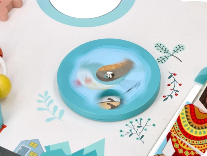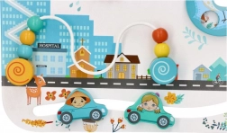 Două roți dințate, mărgele glisante și mașinuțe, precum și figurine rotative antrenează priza, coordonarea și gândirea logică.