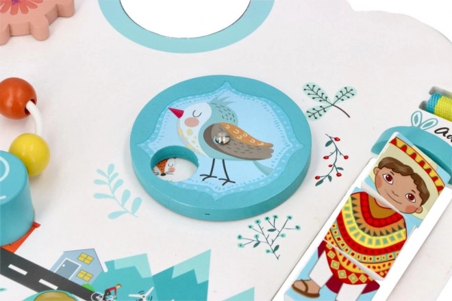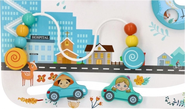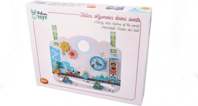 Tabla din lemn „Copiii lumii” este concepută pentru a susține în mod natural dezvoltarea senzorială și explorarea autonomă. Decorul urban pastelat cu animăluțe, mașinuțe și personaje invită la descoperire și stimulează imaginația. Copilul își alege singur ritmul și modul de joacă, consolidând încrederea în sine și răbdarea.
