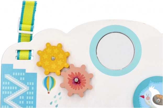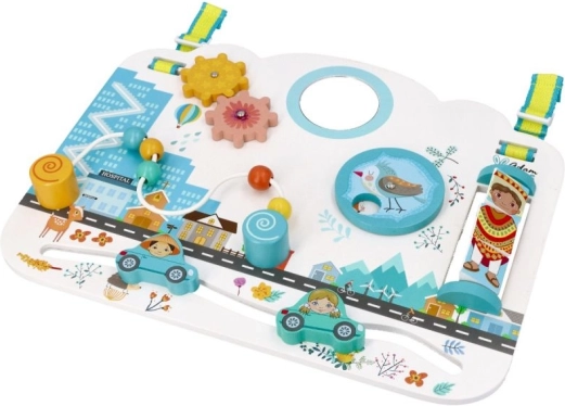 Elementele interactive precum roțile dințate, mărgelele și mașinuțele glisante, oglinda sigură antishatter sau rotița rotativă cu animăluțe ascunse susțin motricitatea fină, concentrarea și gândirea cauză–efect. Datorită curelelor reglabile, tabla este practică acasă și în călătorii – poate fi așezată în fața copilului sau agățată de pătuț.