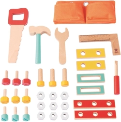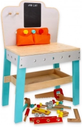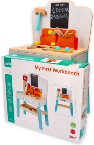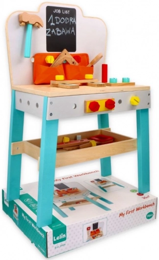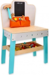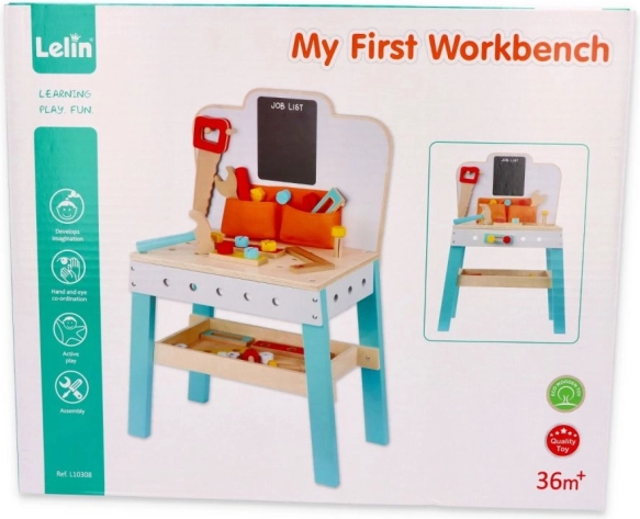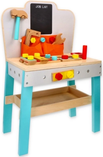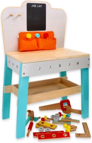 Biroul de lucru din lemn pentru copii cu tablă este un cadou ideal pentru micii meșteșugari. Biroul include instrumente din lemn adecvate, precum ciocan, ferăstrău și cheie, care permit copiilor să simuleze diverse activități de construcție și reparație. Cu tabla LISTA DE SARCINI, copiii pot planifica proiectele lor și învăța să-și organizeze munca. Buzunarele practice pentru instrumente și etajerele oferă spațiu suficient de depozitare.