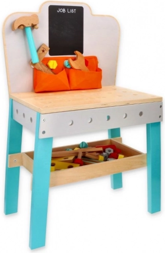 Birou din lemn cu instrumente din plastic colorate precum ciocane și șuruburi. Tabloul 'LISTA DE SARCINI' încurajează planificarea și creativitatea.