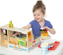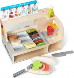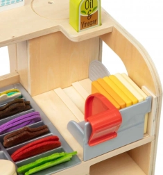 Acest pult de sandvișuri realist le permite copiilor să combine după plac chifle, brânzeturi, legume și sosuri. Piesele din lemn și fetru sunt plăcute la atingere și rezistente, astfel încât jocul poate avea loc zilnic. Setul include și o sortare clară a ingredientelor și instrucțiuni ilustrate simple, care îi ghidează pe copii pas cu pas.