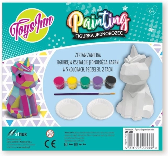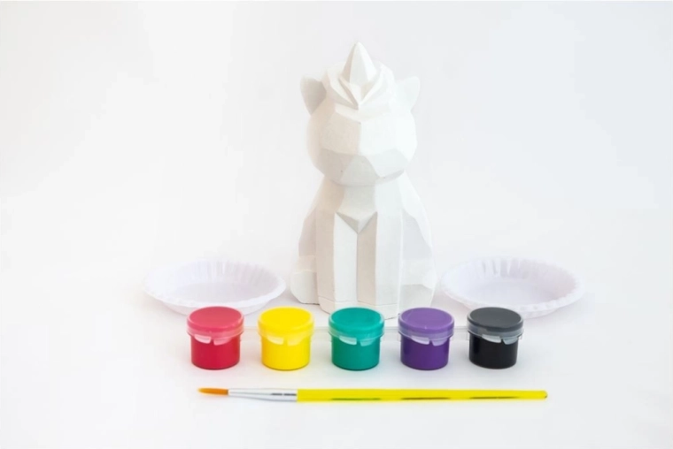 - Set complet – figurină unicorn, 5 culori, pensulă și 2 tăvițe pentru amestec.