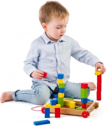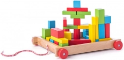 Căruciorul din lemn cu cuburi este o jucărie atemporală care îmbină mișcarea cu creația. Copiii pot trage căruciorul prin cameră și pot construi din cuburi turnuri, căsuțe și structuri simple. Culorile vii invită în mod natural la joacă și exersează recunoașterea formelor și culorilor.