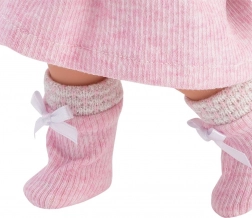 Valeria este îmbrăcată în rochii roz și un pulover cu fundițe decorative, confecționate din bumbac organic și materiale reciclate pentru maxim confort și stil.
