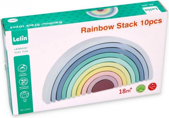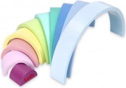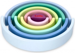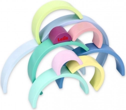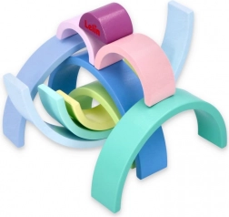 Arcadele din lemn în culori pastelate precum albastru, verde și roz susțin cunoașterea culorilor și jocul creativ.