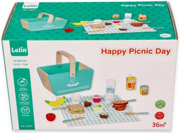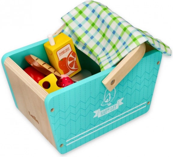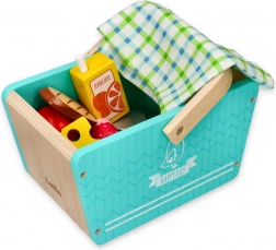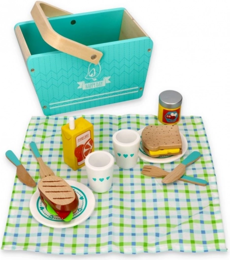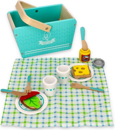 Acest set de picnic în nuanță mentă îi va încânta pe micile gazde. În coșul din lemn solid găsiți farfurioare, tacâmuri și o selecție colorată de alimente din lemn – produse de panificație, brânză, fructe și băuturi – împreună cu un șervet cu model în carouri pentru un aranjament de masă stilat. Setul este ideal pentru jocuri de rol și învățare prin joc.