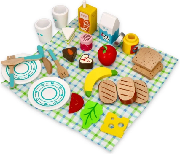 Datorită pieselor fin finisate, jocul este sigur și plăcut la atingere. Copiii își exersează motricitatea fină, coordonarea mână–ochi și comunicarea în timpul jocului împreună. După picnic, totul se depozitează ușor înapoi în coș, astfel că setul este practic atât pentru transport, cât și pentru ordine.