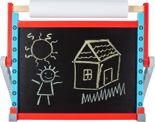 O față este o tablă clasică pentru cretă, cealaltă este o suprafață albă magnetică pentru markere și magneți. Copiii pot alterna ușor tehnicile și stilurile de desen.