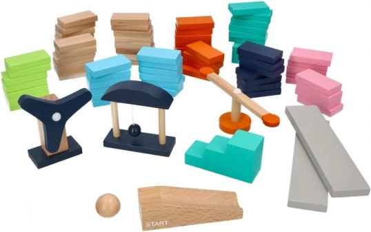- 120 de cărămizi din lemn în 6 culori, 3 elemente mecanice (de ex. carusel, morișcă, poartă cu bilă), 2 plăci-pod, trepte cu 3 niveluri, rampă de start cu bilă