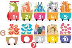 Descoperiți un puzzle educativ distractiv cu motivul unui tren lung și pasagerii săi. Setul conține 30 de piese, dintre care 10 discuri detașabile cu numere pentru a fi plasate în orificiile corecte. Ideal pentru copii de la 3 ani – dezvoltă motricitatea fină, logica și învățarea numerelor până la 10 prin joacă creativă cu piese mari și rezistente.