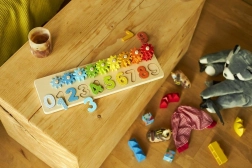 Acest joc de sortare din lemn GOKI oferă copiilor o modalitate jucăușă de învățare. Fiecare cifră 0–9 are propriul pin și o roată dințată asortată coloristic. Copiii pot începe prin potrivire după culori și, treptat, să treacă la recunoașterea numerelor și numărare. Prin rotirea unei rotițe se învârt și celelalte, ceea ce susține gândirea logică și înțelegerea conexiunilor.