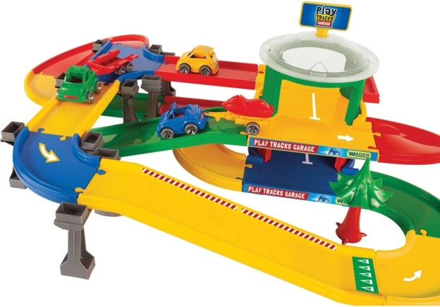 Mega garajă cu traseu din seria Play Tracks Garage oferă o construcție inovativă și ușoară, pe care o asamblați cu ușurință în diferite forme de trasee. Sistemele noastre de traseu au o lungime de până la 5,5 m și includ un garaj pe două nivele.