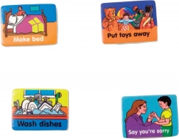 Patru cartonașe diferite ilustrează sarcini casnice, precum făcutul patului sau spălatul vaselor, și ajută copiii să își amintească de responsabilitățile lor.