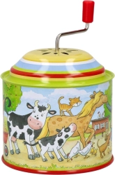 Cutia muzicală este decorată cu ilustrații colorate ale unei ferme, cu personaje precum vaci, cai, pisici și găini.